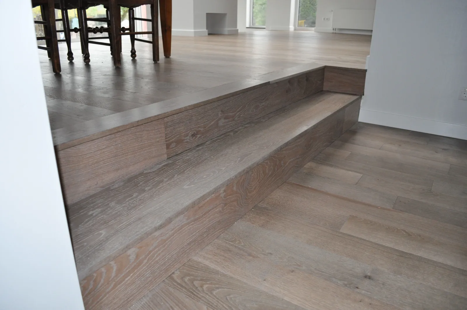 Nieuw eiken hout dat door middel van speciale technieken verouderd en behandeld wordt zodat het een doorleefde uitstraling heeft.